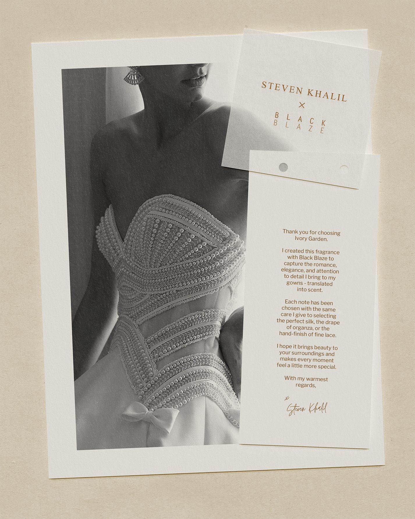Australia’s foremost bridal and red-carpet couturier, Steven Khalil, has partnered with Black Blaze to create Ivory Garden — a signature fragrance that captures the same romance, elegance and attention to detail that define Khalil’s internationally celebrated gowns.