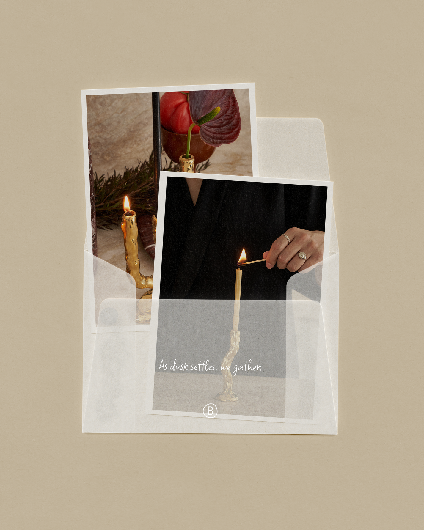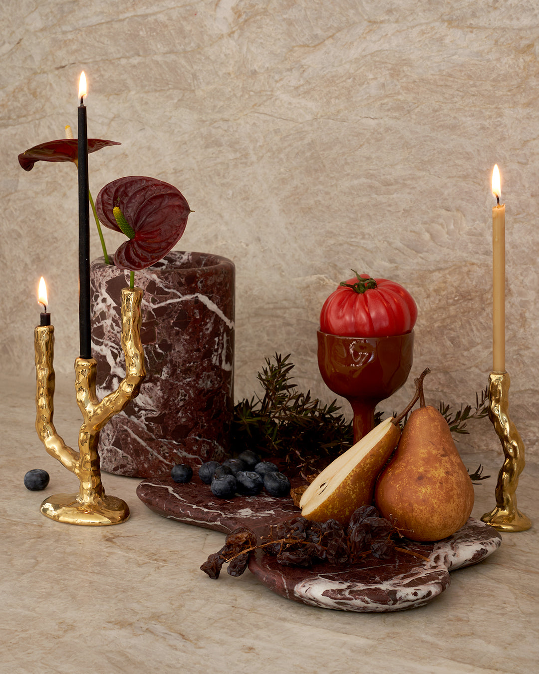 Dusk gathers and the room softens into celebration. Rosso Levanto marble grounds the table in deep, veined colour across the wine cooler, platter, and coasters. A Twig Brass Candle Holder lifts a beeswax dinner taper, while a solid brass matchbox offers the quiet spark. Together they shape an evening ritual made for lingering.