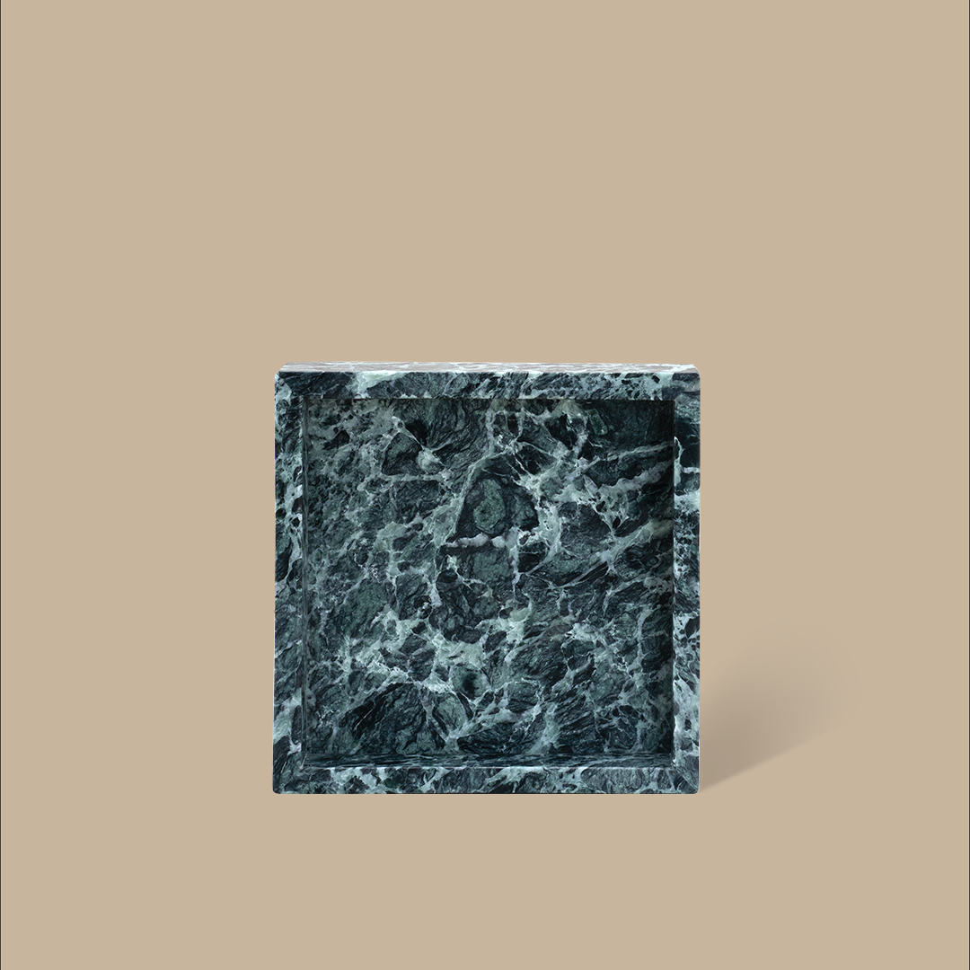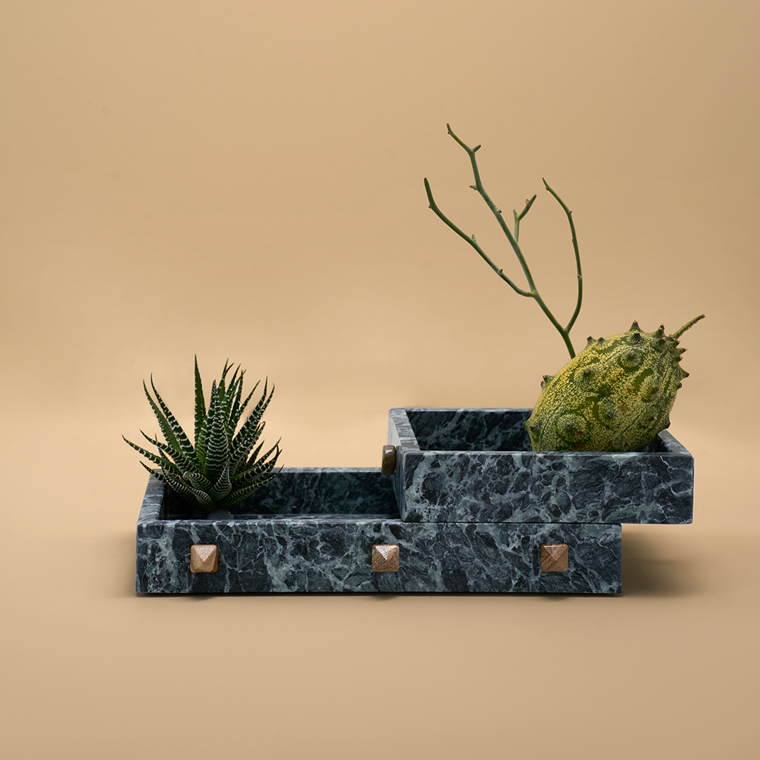 Crafted in White Onyx and Verde Alpi Marble, the Forma Collection balances sculptural form with refined detail. Inset stone buttons and bold joints echo vintage fashion and architectural precision.