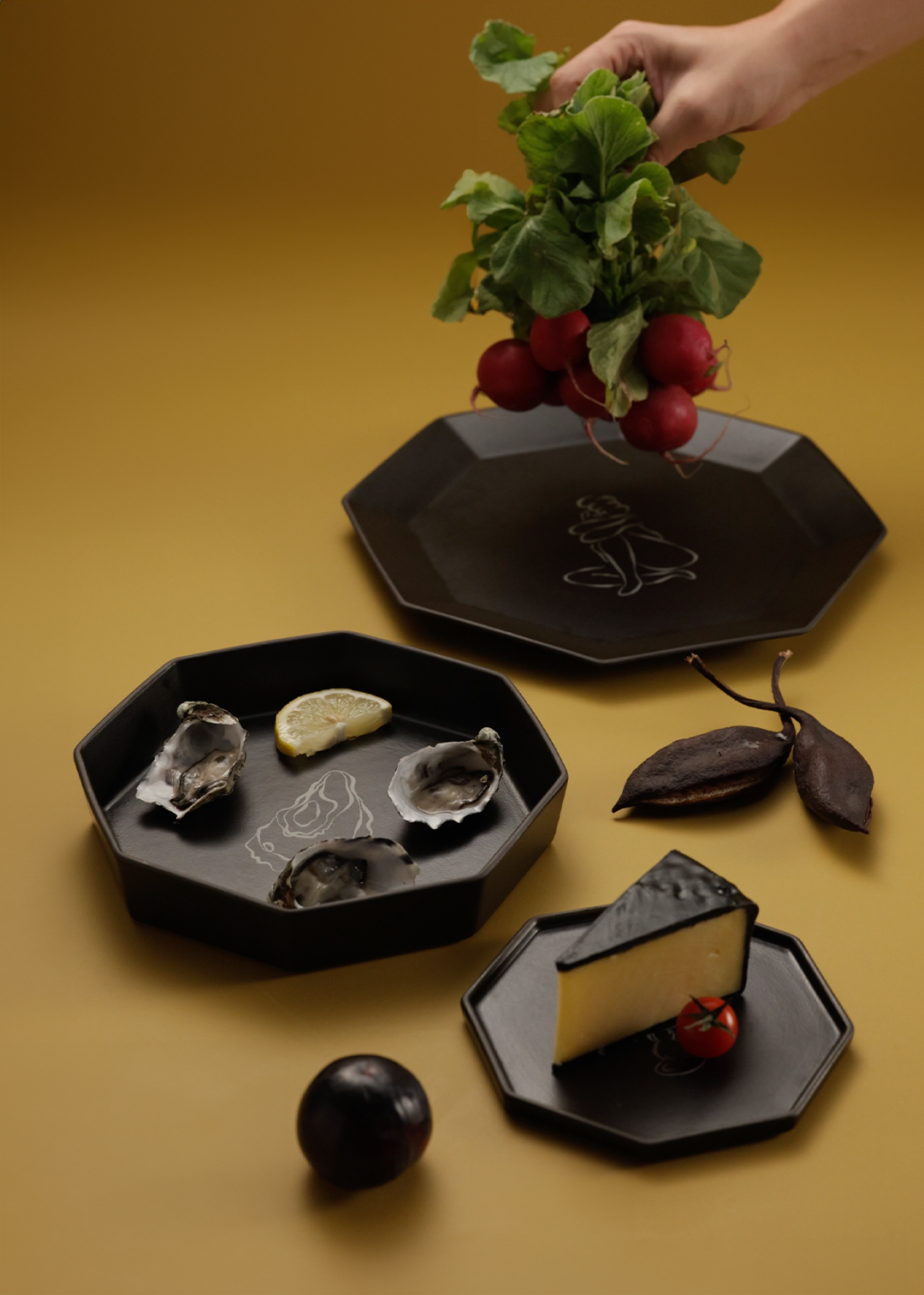 The GEM Tableware Collection seamlessly blends contemporary minimalism with playful geometric elements. Each piece is meticulously handcrafted, with the enamel carefully removed by hand to reveal the raw, uneven beauty of black clay along the edges. This distinctive contrast highlights the material's natural texture, imbuing every piece with unique artisanal charm and adding a touch of elegance to any table setting.
