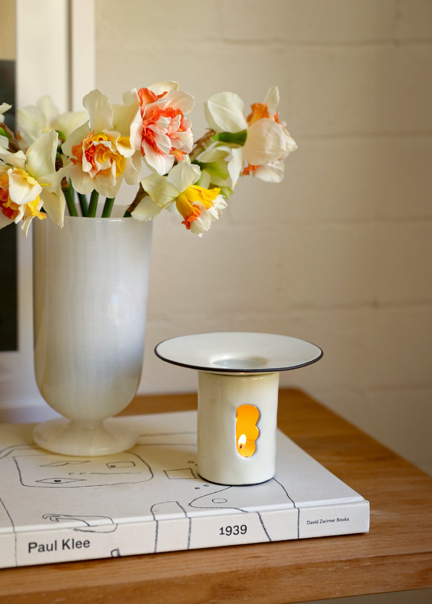 Illuminate your scent exploration with Lumière Oil Burner. Minimalist in design, it stands tall like a torch, acting as a beacon for fragrance discovery. To use, place a tea-light candle in the base, light it, and insert the oil plate. Pour water into the burner up to the plate's edge and add 3-5 drops of your favorite oil, adjusting to your preferred intensity. Relax and enjoy.